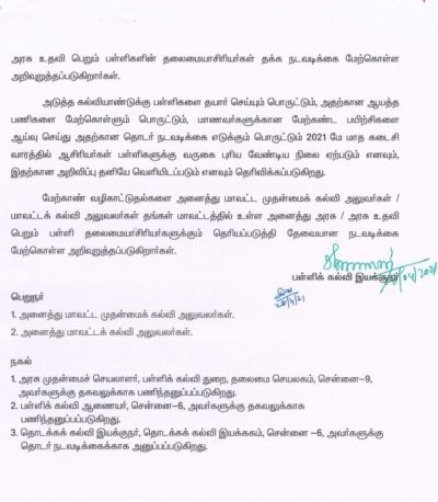 இந்நிலையில், தமிழக பள்ளிக்கல்வித்துறை இயக்ககம் அனைத்து மாவட்ட முதன்மைக்கல்வி அலுவலர்களுக்கும், அனைத்து கல்வி மாவட்ட அலுவலர்களுக்கும் அனுப்பியுள்ள மின்னஞ்சலில் கூறியிருப்பதாவது,
