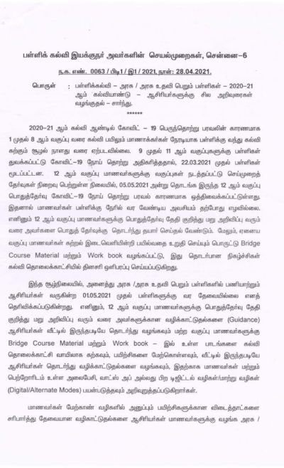 இந்த சூழ்நிலையில், தமிழகம் முழுவதும் அரசு மற்றும் அரசு உதவிபெறும் பள்ளிகளில் பணியாற்றும் ஆசிரியர்கள், வருகிற மே 1ந்தேதி முதல் பள்ளிக்கு வரத்தேவையில்லை என்று தெரிவிக்கப்படுகிறது. எனினும் 12ம் வகுப்பு மாணவர்களுக்கு, தேர்வு தேதி அறிவிப்பு வரும் வரையில், அவர்களுக்கு வீட்டிலிருந்தபடியே கற்றல் வழிகாட்டுதல்களை மேற்கொள்ளவும், இதர வகுப்பு மாணவர்களுக்கு, அண்மையில் வழங்கப்பட்டுள்ள இணைப்புப்பயிற்சி கட்டகம், பயிற்சித்தாள்கள் மூலம் தொடர்ந்து பயிற்சிகள் வழங்கிடவும், அதற்காக மாணவர்கள்,பெற்றோரிடம் உள்ள செல்லிடப்பேசி, வாட்ஸ்அப் உள்ளிட்ட இதர டிஜிட்டல் வழிகளை பயன்படுத்திடவும் அறிவுறுத்தப்படுகிறார்கள்.