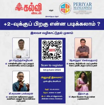 கல்வி விகடன் சார்பில் '+12-வுக்கு பிறகு என்ன படிக்கலாம் ? ' என்ற உயர்கல்விக்கான இலவச வழிகாட்டி நிகழ்ச்சி வரும் சனிக்கிழமை ( 20.5.2023) அன்று சென்னையில் உள்ள விகடன் அலுவலகத்தில் நடைபெறவிருக்கிறது. கல்வியாளர்கள் தா.நெடுஞ்செழியன், 'ஆனந்தம்' செல்வகுமார், கி.சரவண பாஸ்கரன், நித்யா.கு ஆகியோர் இந்நிகழ்வில் உயர்கல்வி தொடர்பான உங்களின் கேள்விகளுக்கு பதிலளிக்க காத்திருக்கிறார்கள்.